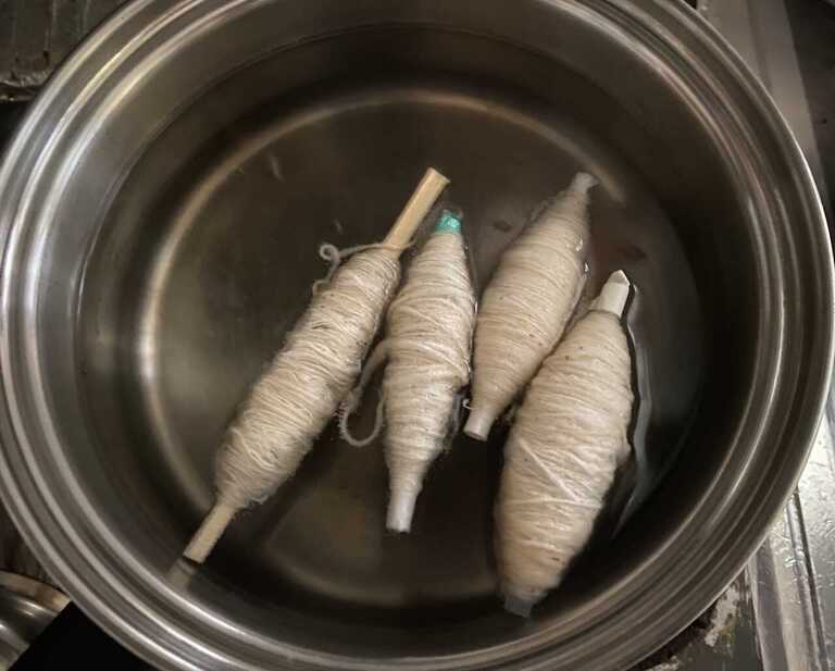 まずはスピンドルで紡いだ手紡ぎ糸をお湯で茹でます。茹でても問題ない割り箸などに糸を巻き取り、沸騰したお湯で糸が少なければ20分程度、多い場合は60分ほど茹でます。今回の写真程度の量であれば30分でよいでしょう。