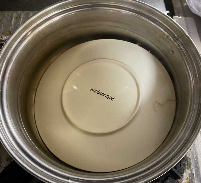 天然繊維には油分があってなかなか沈みません。落し蓋で沈め、お湯の蒸発を避けるために鍋に蓋をして少しだけ開けておきます。油分がにじみ出てくるのでお湯は徐々に茶色に変化します。茹で上がったらタオルの上に置いて、軽く押してタオルドライをします。