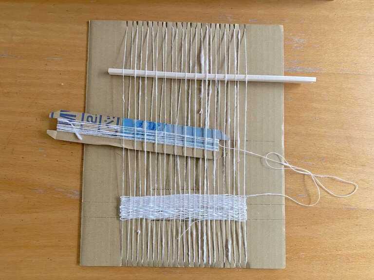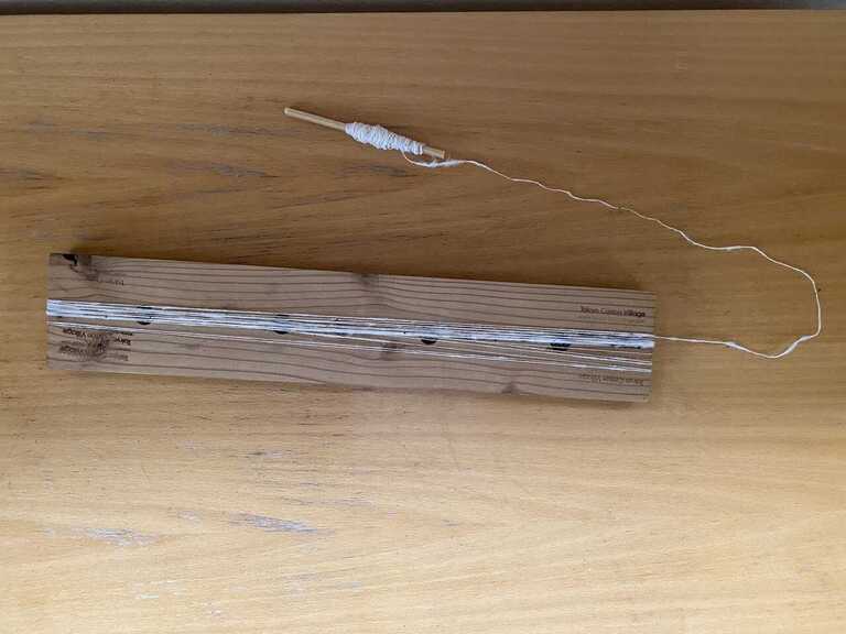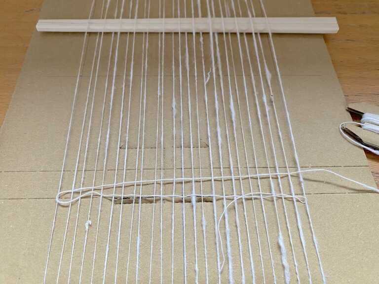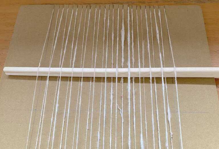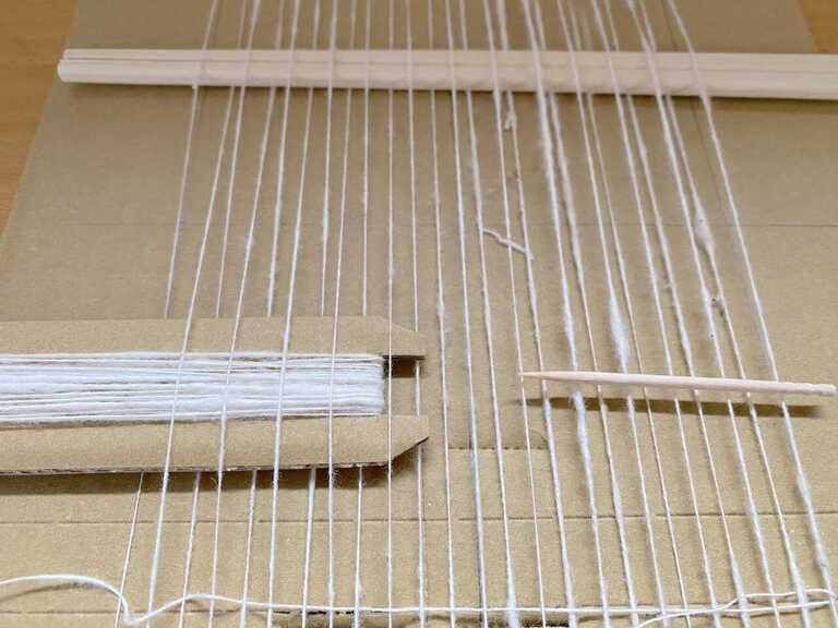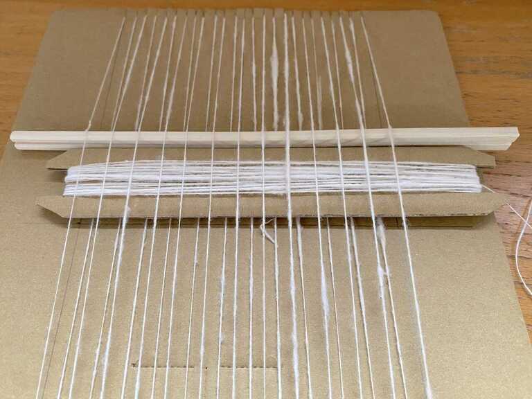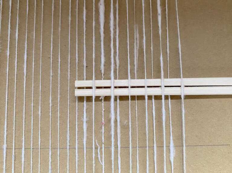 セットした経糸に割り箸を入れていきます。その際、奇数糸が上に、偶数糸が下に来るように上下交互に差し入れていきます。次に段ボール紙で作ったシャトルに緯糸を巻いていきます。ここで重要なのは、緯糸を巻いたシャトルを厚く(高く)しないこと。緯糸をたくさん巻いて厚く(高く)なったシャトルは、経糸間を通しにくく、無理に通すと経糸が切れてしまう恐れがあるからです。