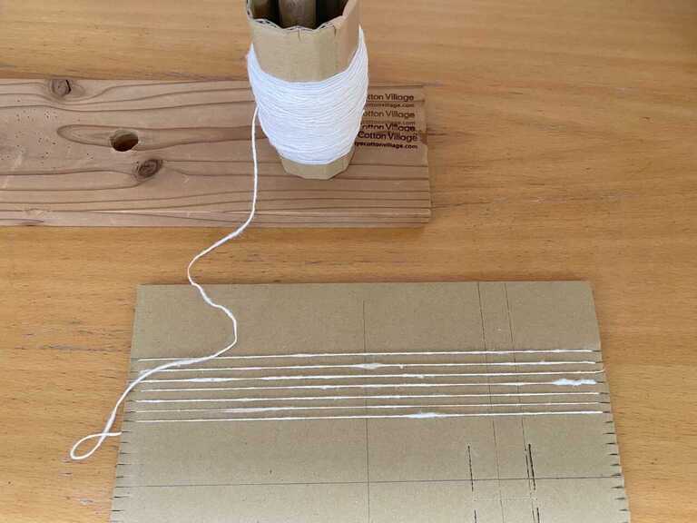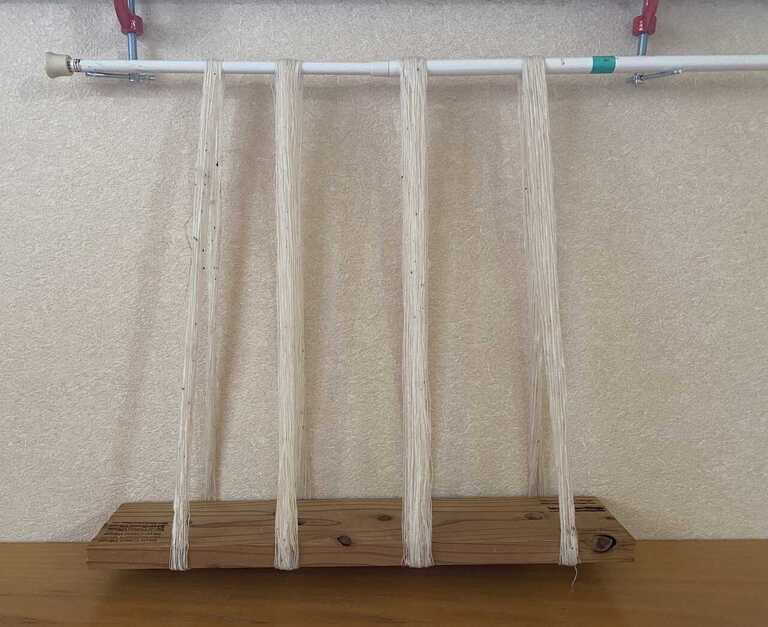 この後、手紡ぎ糸には糸の毛羽立ちを抑え、緯糸の滑りを良くする「しょうふ糊」などを施します。滑りを良くすることで経糸が切れることを防ぐのですが、今回は段ボール織りの小さな作品になりますので割愛します。