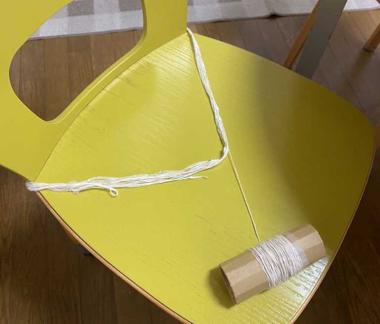 糸を長めの板状のモノに巻きつけ、大きな輪状にまとめたものが綛(かせ。巻き取って輪形に結束した糸)です。巻き取った綛には、下部におもりになるものをぶら下げて乾燥させると糸が真っ直ぐになります。糸が乾いたら、ダンボールで作った糸巻に巻き取りましょう。この際、椅子の背もたれ等、綛の長さ・大きさにあったものを使用すると途中で絡まることなく綺麗に巻き取ることができます。今回は茹で上がってから綛にまとめましたが、初めに綛を作ってから茹でても大丈夫です。