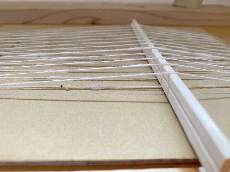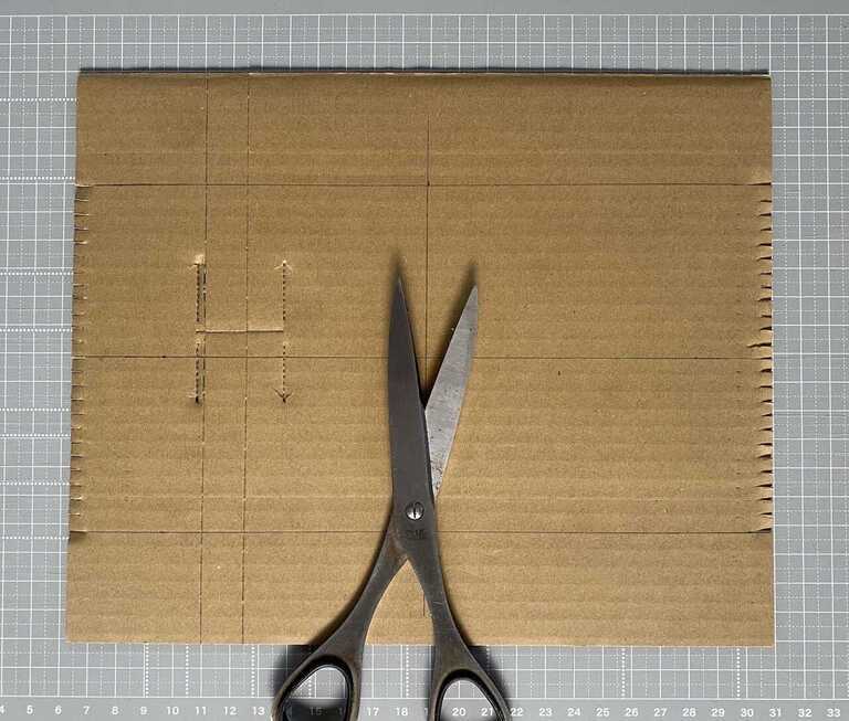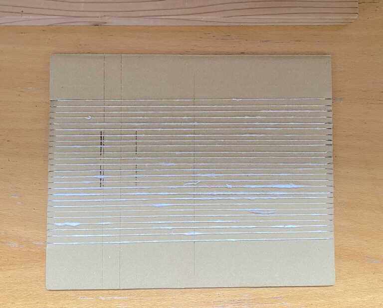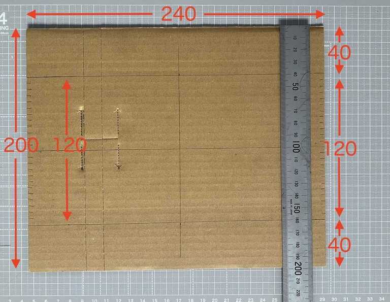 今回織り上げる布は120×120mmなので、織り機本体の寸法はふたまわり大きい240×200mmとしました。短辺の両サイドから40mmの余白をとり、残る120mmを5mm刻みでマーキングして切れ目を入れます。この切れ目が経糸を保持するスリットになります(制作写真は画角の都合で90°転倒しています)。