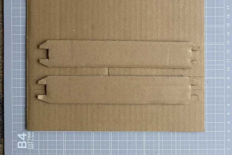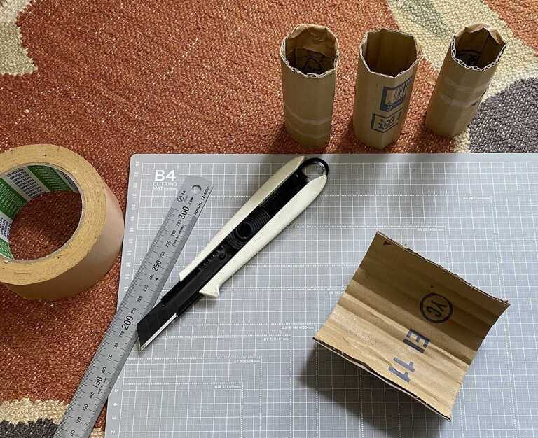 つくるのは織り機本体と緯糸を巻きつけるシャトルの2つ。段ボールは厚くて強いものがよいので、今回は2Lのペットボトル飲料が6本入っている箱を使用しました(重たいものを入れる箱は丈夫にできています)。経糸が多いほど、きめ細かな布ができますが、段ボール織りの場合は、緯糸を通す作業を全て手で行うため、今回は経糸25本程度にしておきましょう。
