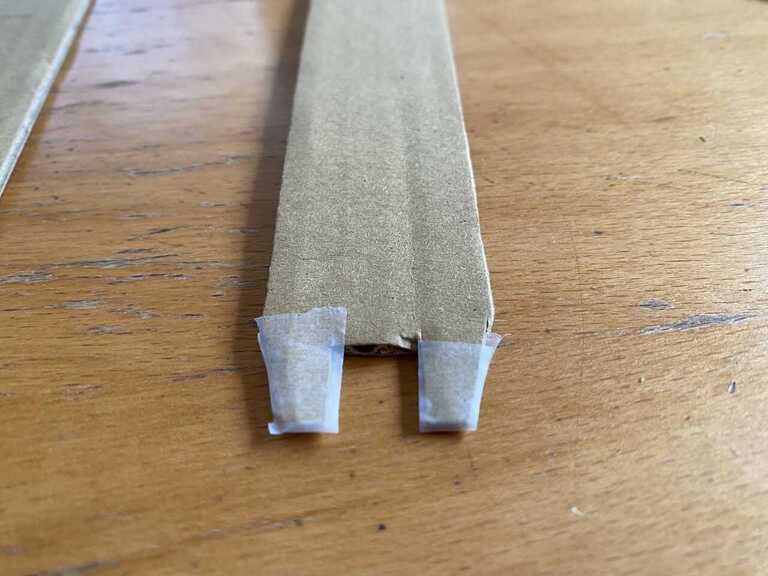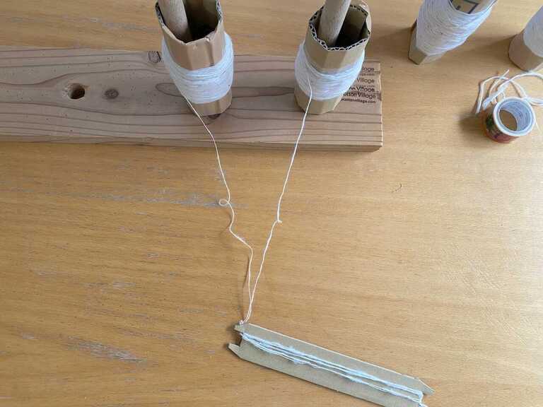 緯糸を巻きつけるシャトルは180×30mmとしました。両端に糸を保持するための凹みをつくり、セロハンテープで端を補強すると経糸にくぐらせるときにスムーズです。残った段ボールから糸巻きもつくっておきましょう。筒状のものに緯糸を巻いてそれを棒状のものに挿すと、糸巻がクルクル回ってシャトルへの巻き取りが容易になります。