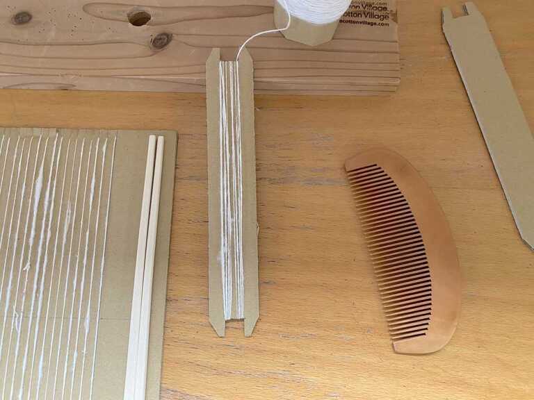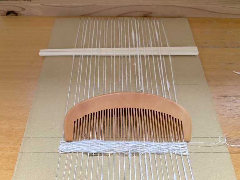 この織り方では、割り箸でつくる隙間があるため往路は通しやすく復路はちょっと面倒になります。行きはよいよい帰りは……ですね。これを繰り返して織り進んでいきますが、気をつけたいのが左端、右端での折り返しです。両端では少しだけ余裕をもたせないと、緯糸が経糸を絞るような力が働き、布全体の横幅にくびれができてしまいます。そして、2往復程度するごとに横糸を櫛(コーム)で軽く手前に優しく寄せて間隔を密にしておきます。機織りの音「トントン」というところです。