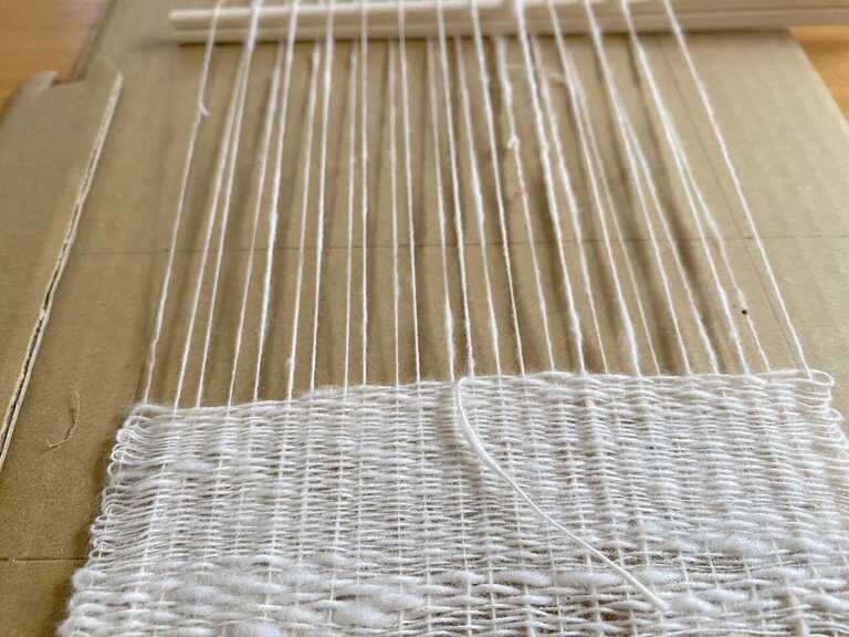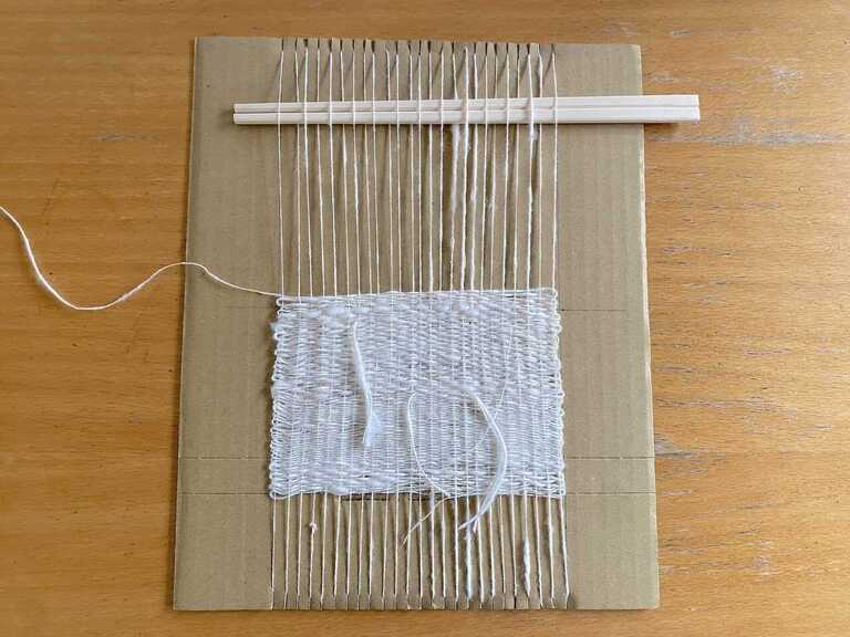 経糸間に通した割り箸を立てて隙間をつくり、その隙間にシャトルに巻いた緯糸を入れていきます。隙間が空いているので容易に通るはずです。帰りは、割り箸を横に倒してシャトルで偶数糸の経糸を一本ずつすくいながら戻ってきます。決して力任せに通さずに、経糸には優しく接してください。一度目の往復ができたら、緯糸の末端を往路と復路の間に通し、経糸に3回から4回ほど縫うようにしてからめておきます。この処理をしないとほつれやすくなります。