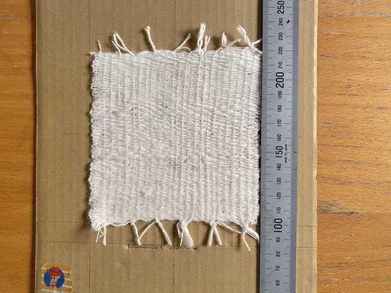 今回は布の大きさを120×120mmとしました。段ボール織りでは、復路で緯糸を戻す際に経糸を切らないようにケアしながら戻るので、横幅としてはこれぐらいのサイズがちょうど良いでしょう。織り上がったら、経糸の上下を切って織り機から外しますが、いきなり全てを切り離してしまうと、ばらけて始末がつけにくくなります。まず経糸を端から4本切り、それを2本ずつに分けてその束を結び合わせてほつれ留めとします(経糸は25本あるので、4本を結束する始末をつけていくと最後の組だけ5本がワンセットになります)。織り機から外したら、最後に布からちょろりと出ている緯糸の末端を切って処理して完成です。