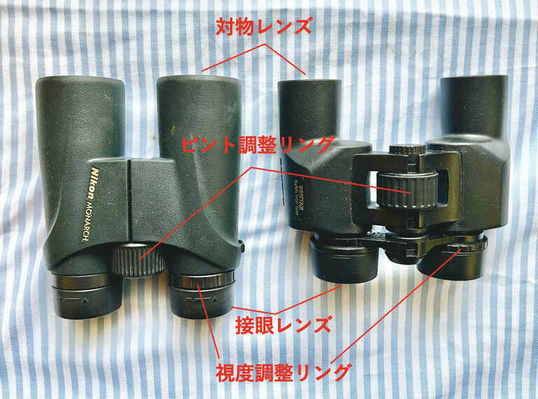 双眼鏡は中央のピント調整リングを回してピントを合わせ、左右の視力差は視度調節リングで補正します。また、左右の筒の間隔を自分の目幅に合わせることで、自然で疲れにくい視界が得られます。