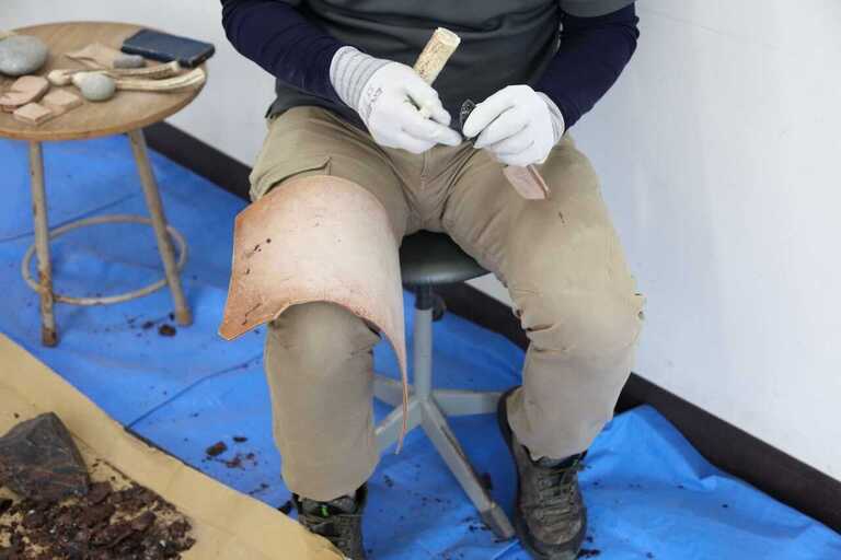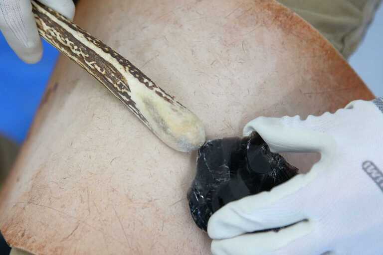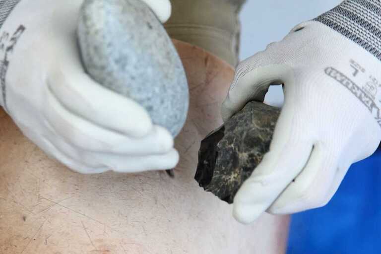 石の加工に必要な道具は、石を打ち割る丸石(鋭い角を丸めるのにも使います)、より精密に割るための鹿角を加工したハンマー、押圧で石片を割りとるための鹿角製押圧具、押圧の際の台座となる革製のスペーサー、足を保護する革製のシートなどです。