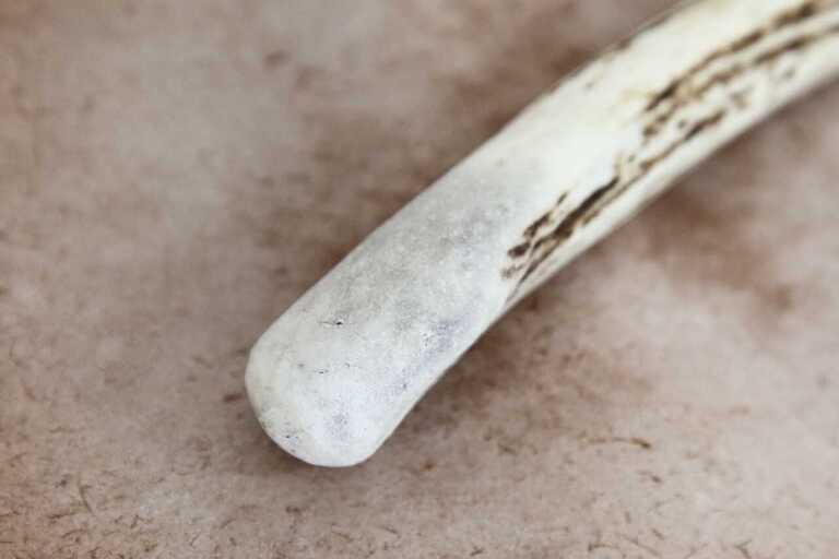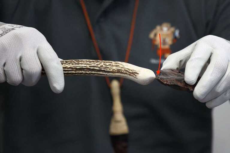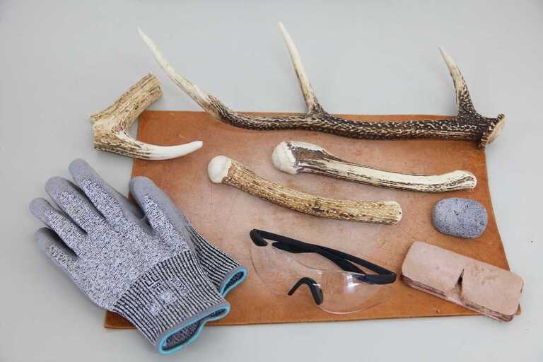 石を成形するハンマーは硬ければ硬いほどよいわけではありません。ほどよい柔らかさがあるほうが石を望む形に成形しやすく、鹿角は理想的な硬さを備えています。鹿角を手に入れたら、大きく割るためのハンマーと押圧に使いやすい部位を切り出して、ヤスリで削って打撃・押圧しやすい形に整えます。