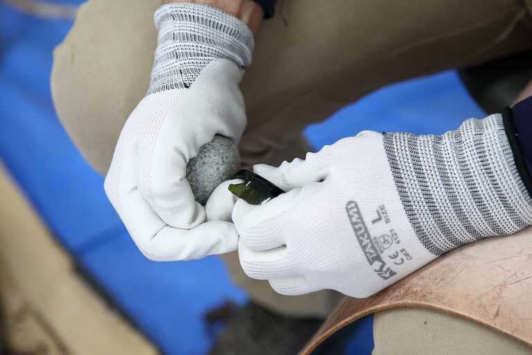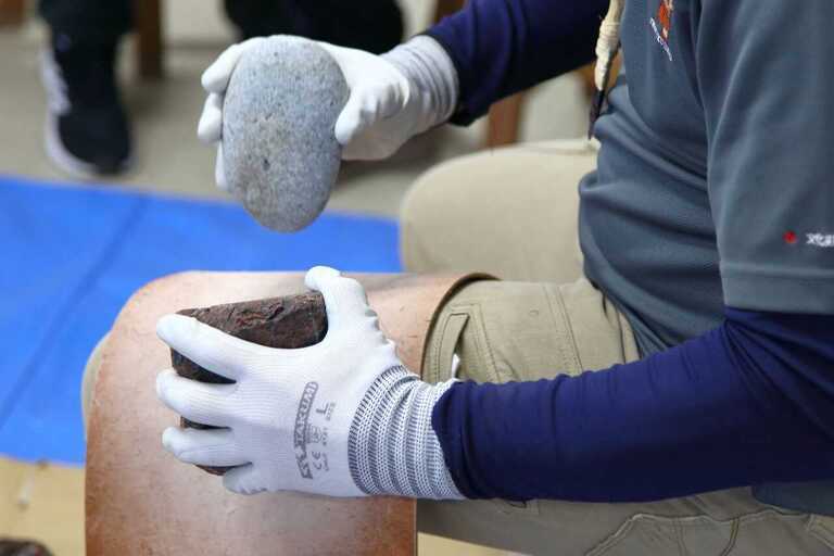 打製石器作りでは鋭い石片が飛び散るので、長袖長ズボンで体を覆い、作業する手には防刃グローブ、目には保護のためのゴーグルを身につけます。足元は靴を履き、靴のなかに石片が入らないように注意して作業を進めます。