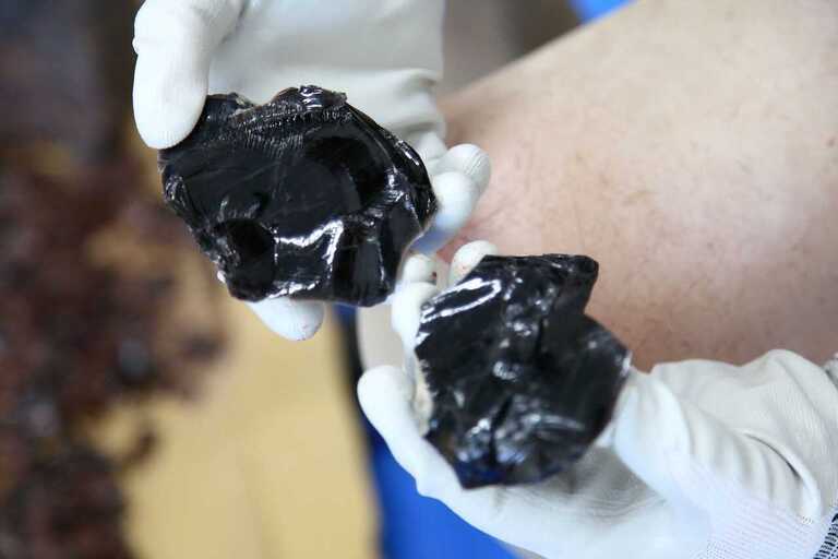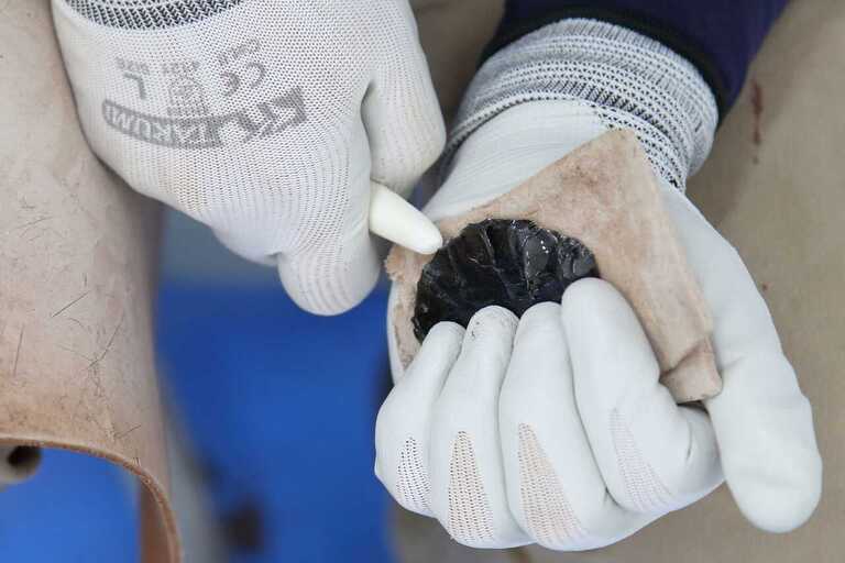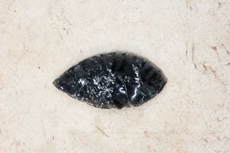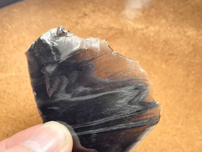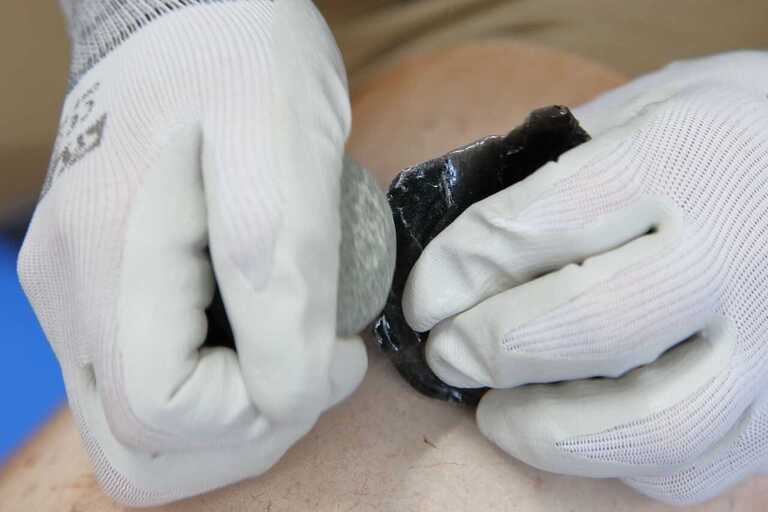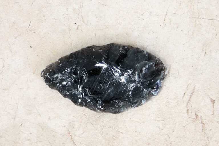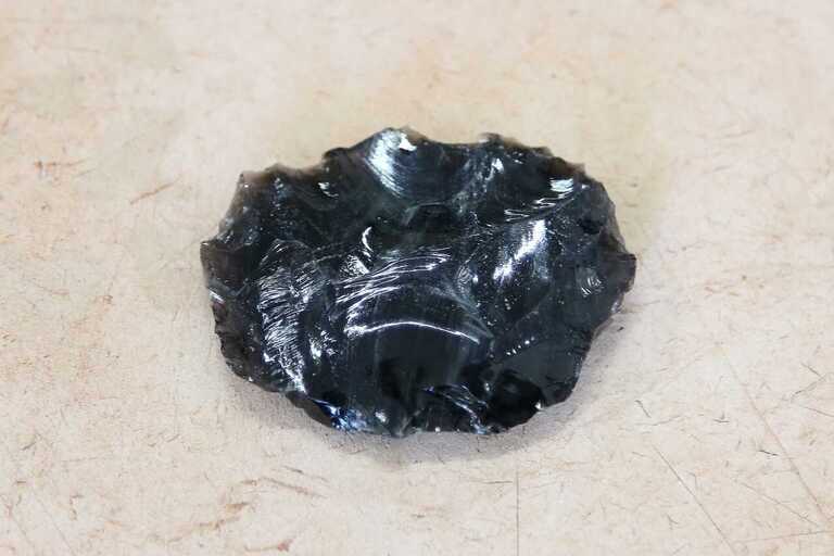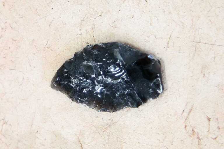 打製石器はチャートや頁岩、安山岩などからも作られますが、私たちは天然ガラスともいわれる黒曜石を素材に使っています。他の石材は黒曜石より硬くて割りづらかったり、石目の影響で割れやすい方向が決まっていたりする場合があります。黒曜石はほぼガラスなので、材質も均質で割れやすく、性質を理解すると望む形に加工できます。