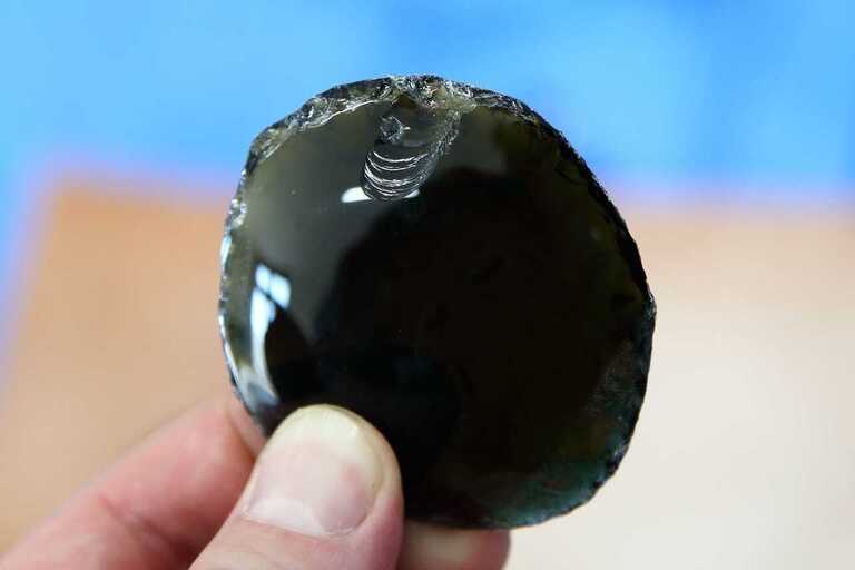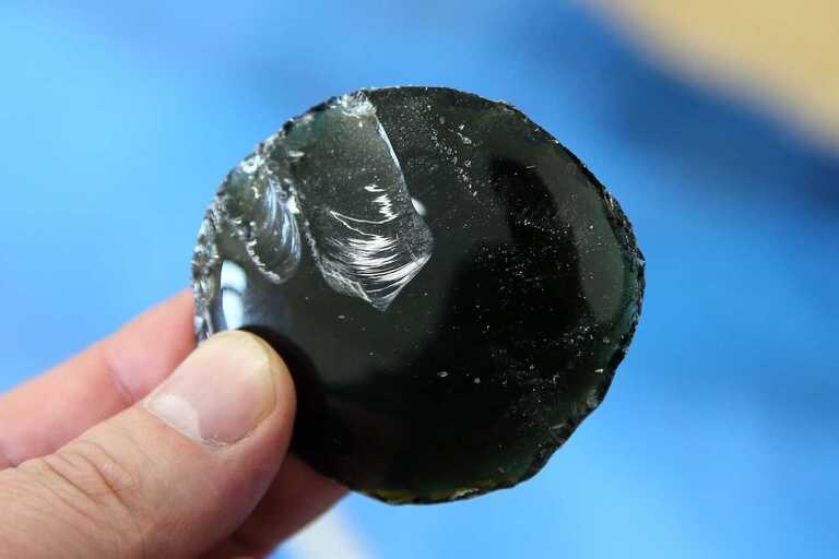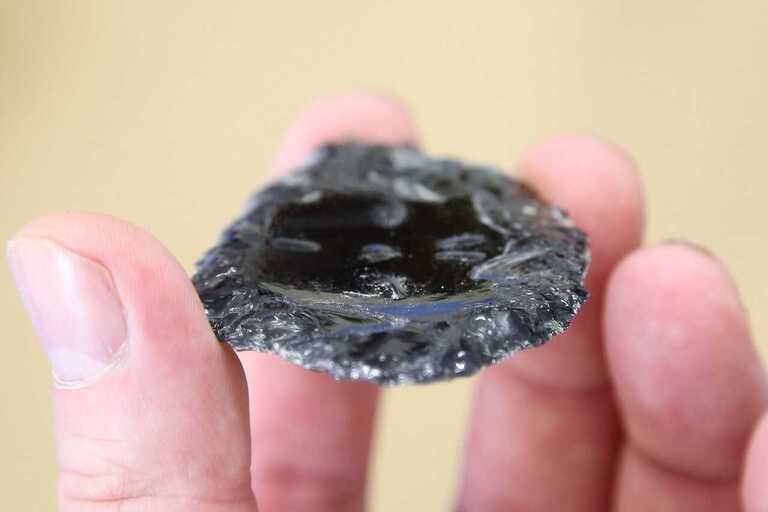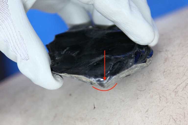 冒頭で黒曜石はほとんどガラスである、と書きました。ということは……ガラスからも石器がつくれます。ガラスは天然の黒曜石とは違って不純物が入らずに質が一定なのが利点として挙げられます。しかし厚みが無いためちょっとした力加減で折れるリスクが高く、難易度としては黒曜石よりも高いと感じています。しかし入手困難な黒曜石よりは手に入りやすいので、まずはガラスから挑戦してみるのもいいのではないでしょうか。