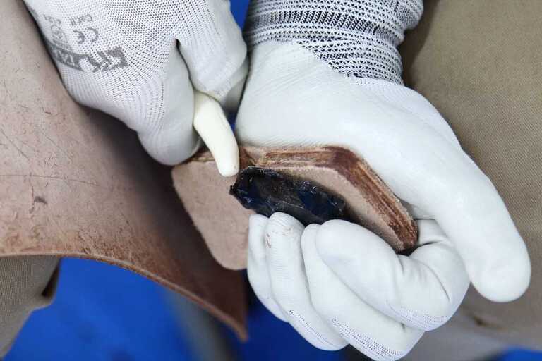 押圧剥離では、革を重ねて作ったスペーサーがあると便利です。剥ぎ取りたい部分をスペーサーの空間部分に載せ、鹿角を押し当ててパキッと剥がしていきます。このとき私は、腕の力だけでなく足の力も使っています。腿の間に石を握った手と鹿角を持った手を入れ、割りたい部分に鹿角を押し当てた状態で足を狭めることで石を剥ぎ取ります。そうすることによって腕の力だけで割るより強い力を加えることができます。