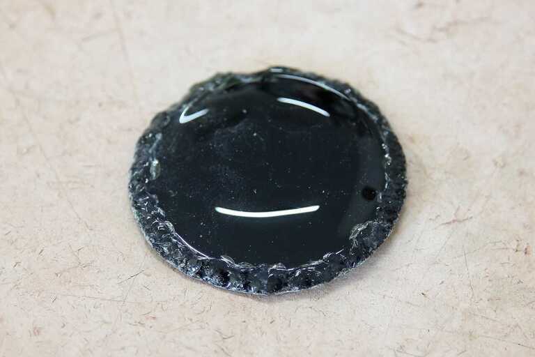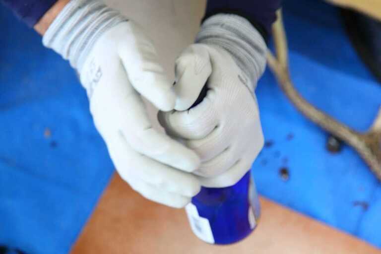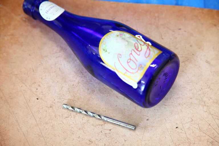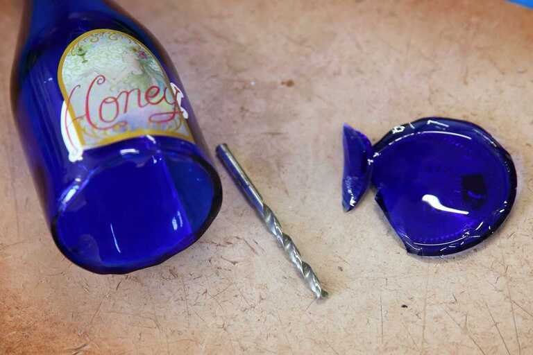 必要なのは底が厚い瓶と鉄の棒。瓶のなかに鉄の棒(ドリルの刃や釘などでOK。長さがあって適度な重みのあるもの)の尖っていないほうを底に向けて入れ、防刃グローブをして瓶の口を押さえて空中で鋭く上下させます。すると鉄の棒が当たった衝撃で瓶の底が丸く抜けます。落ちた瓶底が折れないように床にはやわらかいものを敷いておきましょう。底が抜けたら丸石で縁の出っ張りを削って円盤状に整えます。