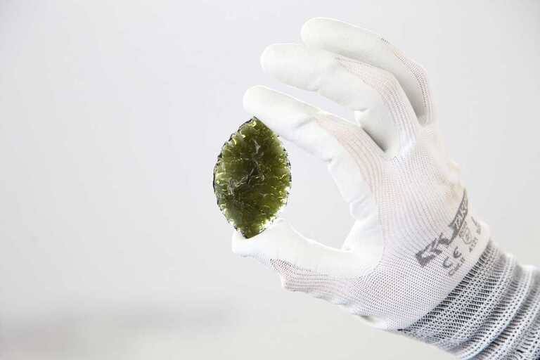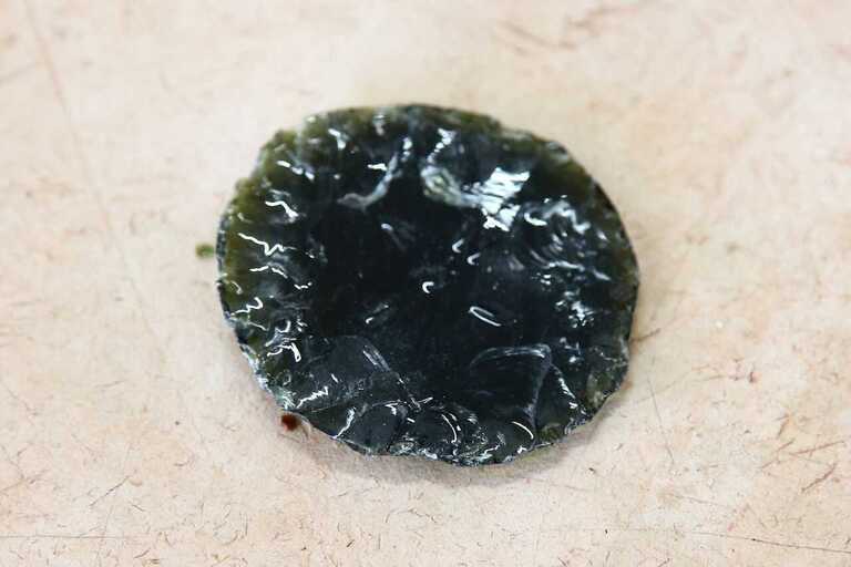両面を剥ぎ取っていっても、終盤まで凹面の影響が残ります。円盤状になるよう剥ぎ取っていき、一回りも二回りも小さくなり、最後の最後にようやく両面の厚みが整ってきます。瓶底で作った石器は光が透過して色が美しいのが特徴。気に入った色の瓶からつくってみましょう。