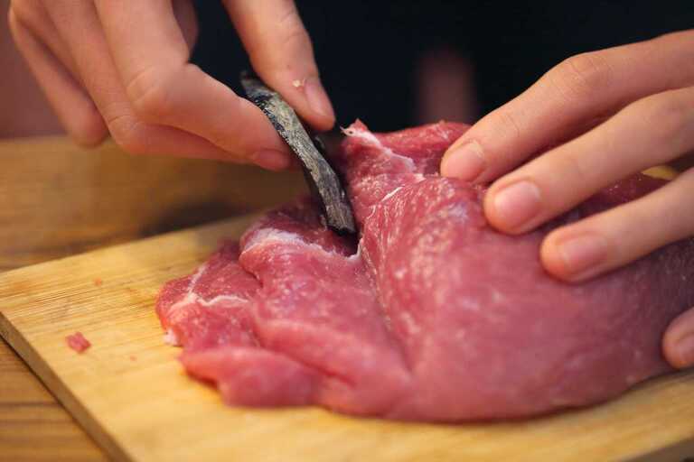 ここで注意したいのが、切るのは肉だけにすること。大根のような素材を切ると黒曜石は簡単に欠けてしまいます。もちろん、切った肉を料理して食べるときは、肉を切るときに石のかけらが肉に残らないように注意しましょう。刃が薄いため少しの衝撃でも刃こぼれするので、切り方にも注意が必要です。