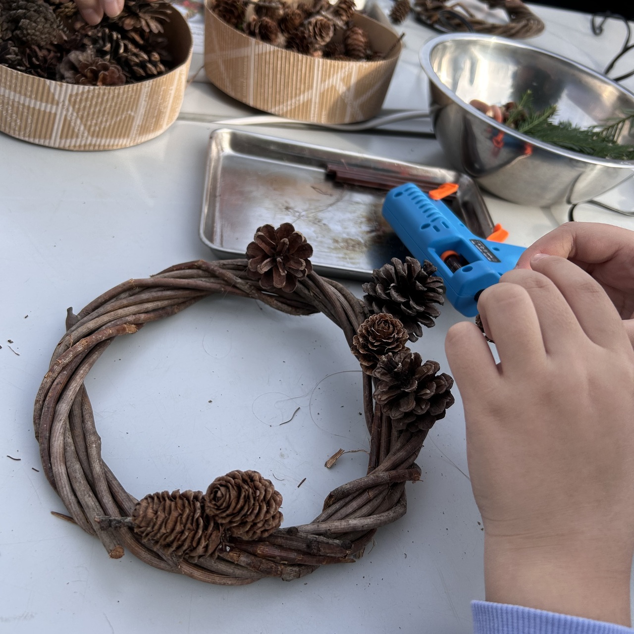 小学校四年生の子供と一緒に参加しました。ツルを巻き付けるのが難しくて、綺麗なリースの形にはなりませんでした。でも飾りをつければ半分隠れるし、素敵な作品が出来上がりました!子供は初めてのグルーガンで、悪戦苦闘していましたが、思った所にすぐに付けられるのが楽しかったみたいです。