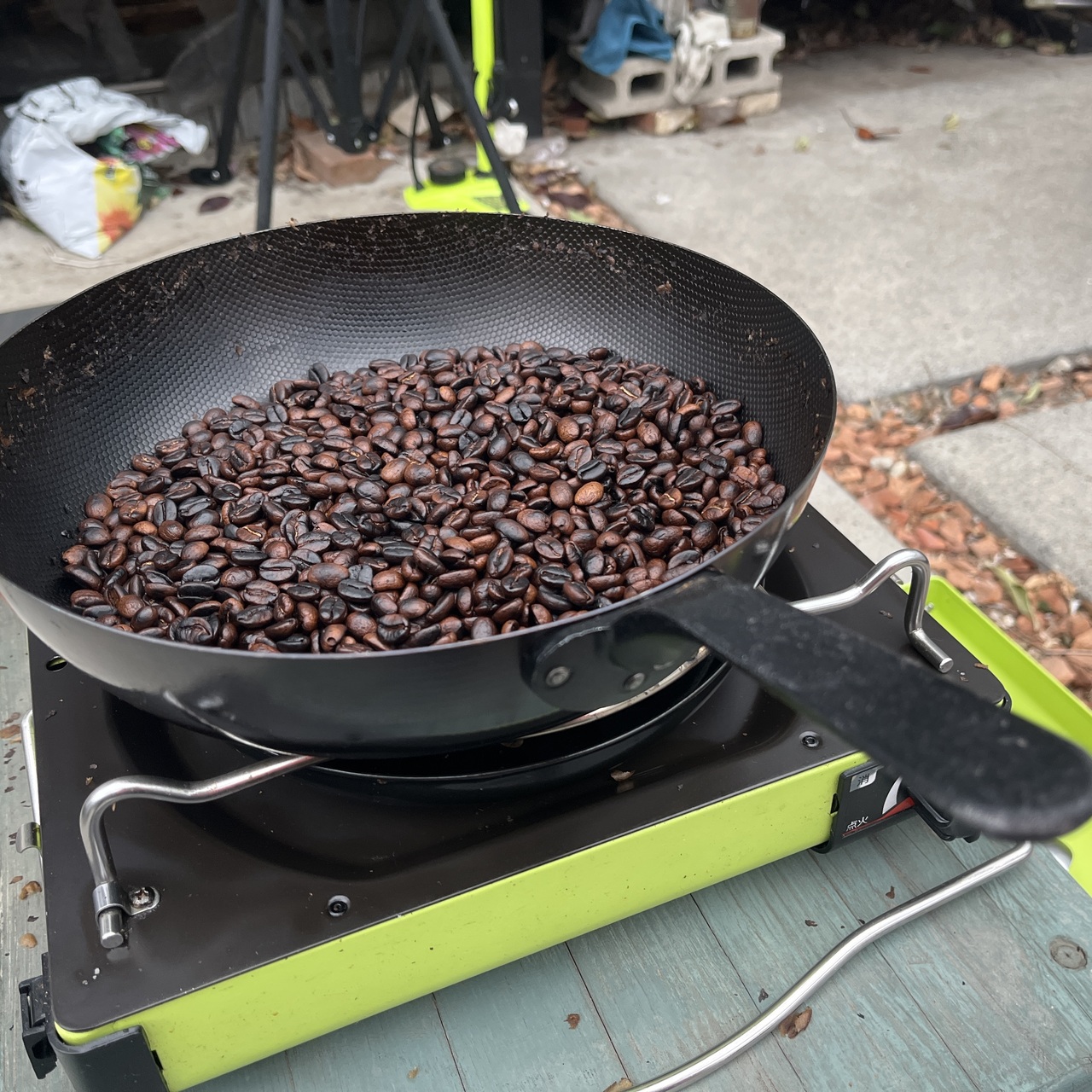 雨か、、ということで以前にこちらのイベントで体験したコーヒー豆焙煎を自宅でやってみた。たくさん炒りたかったのでカセットコンロとフライパン。焦げありムラだけど、まぁ良しとしましょう。