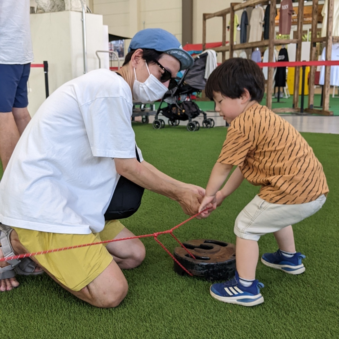 講師の先生はいとも簡単にやってしまうロープワークですが、慣れるまでは大人でも結構難しくご家族での参加は厳しいかと思っていましたが、適応力の高さで小さなお子様も夢中になってトライしていました。ポイントは摩擦のコントロールと同滑車の原理による倍力機構をロープワークで構成することです。これに初めて触れる人は「ロープワークって、すごい!」となるでしょう。 「シート」「ロープ」「石ころ」という最低限度の資材と基本的な数種類のロープワークで作る簡素な屋根だけのシェルターを作りましたが、この体験を通じて「道具を駆使する・使いこなす」感覚を持っていただけたと思います。