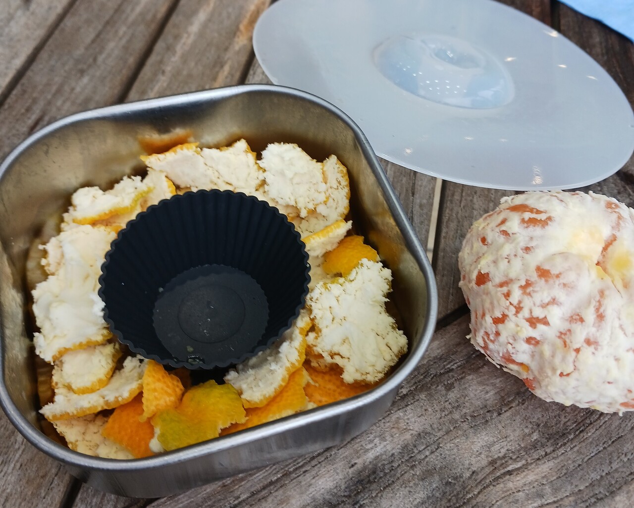 みかんを頂いた後は、蒸留釜となるステンレス器の中央に蒸留水を溜めるシリコンカップを置き、その周囲に細かくちぎった皮を隙間がないように敷き詰めていきます。続いて、皮が浸る程度の水を注ぎます。
