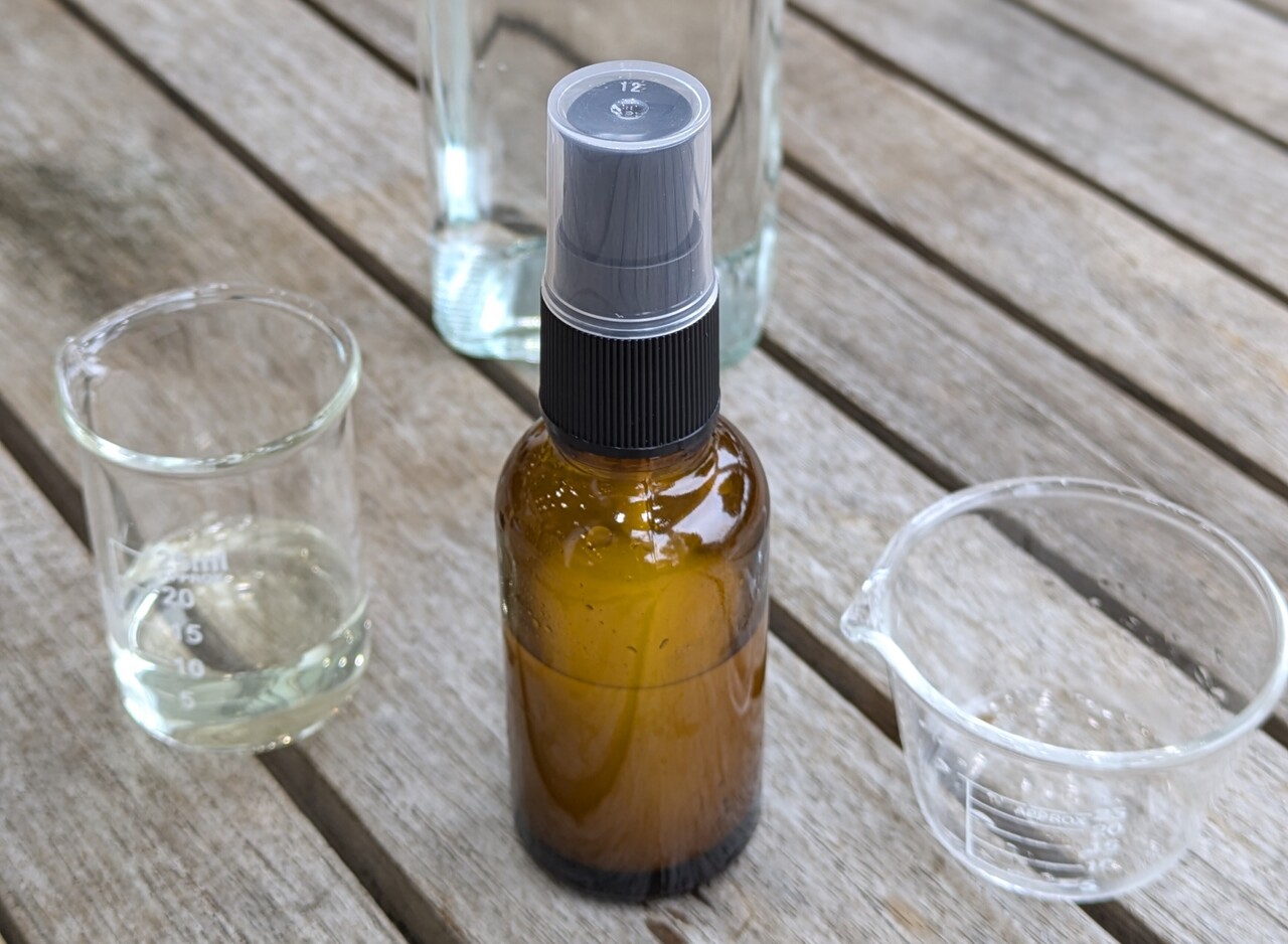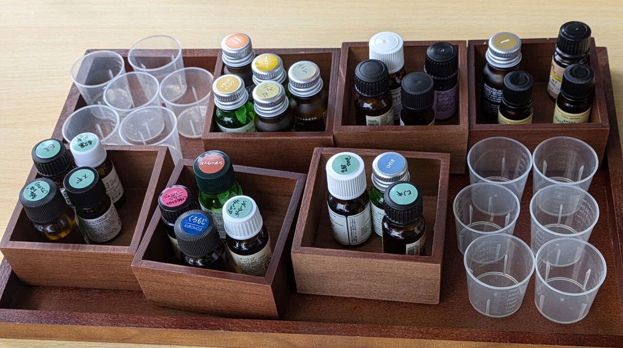 ボトルに、無水エタノールと三森さんがセレクトしてくださったアロマオイル(温州みかん・柚子・オレンジなどの柑橘系やスギ・ヒノキなどのウッド系の100%精油)の中から、自分好みの香りを選んでよく混ぜます。そして最後に、みかんの蒸留水を入れて完成です!