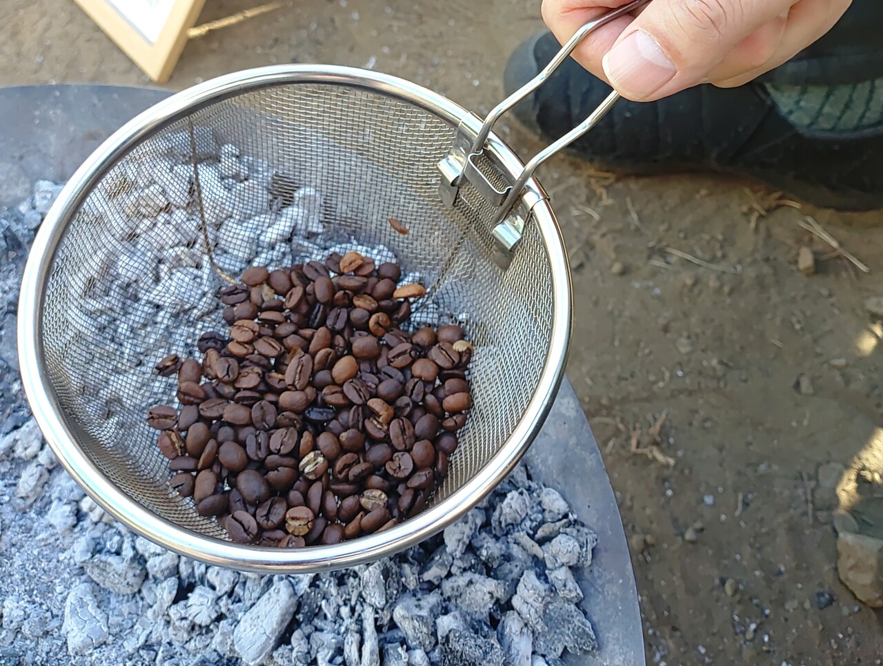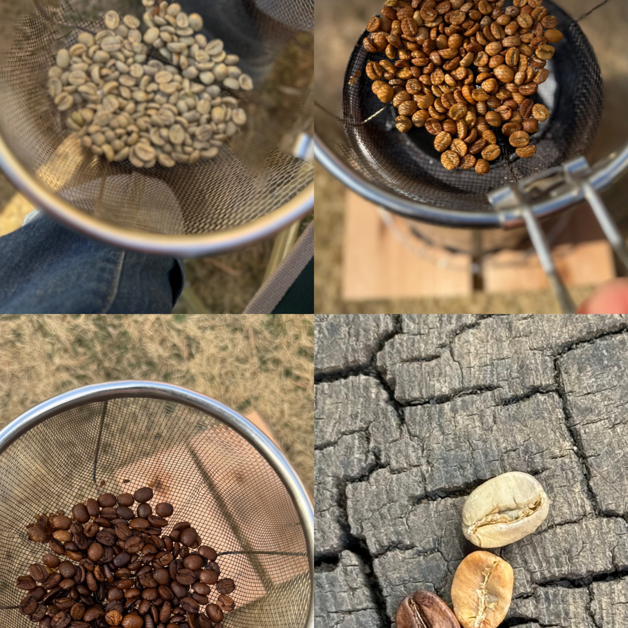生豆を入れたザルをウッドストーブの上にセットし、手のひらで熱さを確認しながら適温をキープ。ザルを熱源から離すことなく、ゆっくりと円を描くように回転させていきます。この工程を5~10分間継続することで、豆の内部まで均等に熱が行き渡り、水分が適度に抜けて焼きムラのない仕上がりに。参加者の皆さんは、立ち上る芳醇な香りに包まれながら、完成への期待を胸に丁寧に作業を重ねていました。