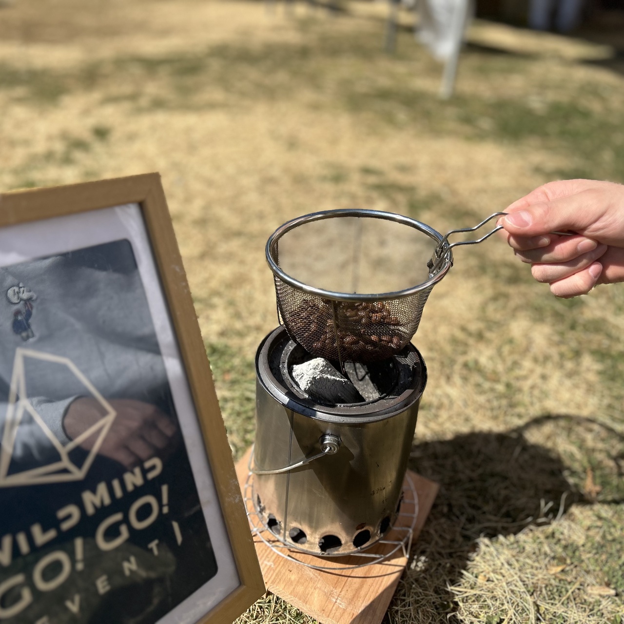 宮原さんが美味しいコーヒーを淹れるためのコツを丁寧にレクチャー。藤原祥弘さんが手作りしたウッドストーブを使用し、香ばしい香りととも本格的な炭火焙煎体験がスタート!